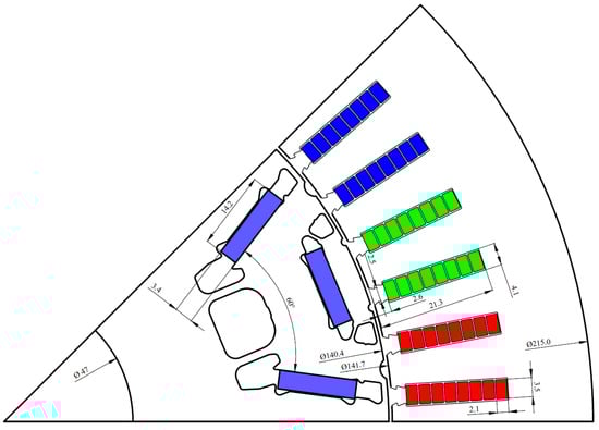Machine geometry—detailed view of one pole. Dark red: phase A; green: phase B; dark blue: phase C; light blue: north pole magnets.