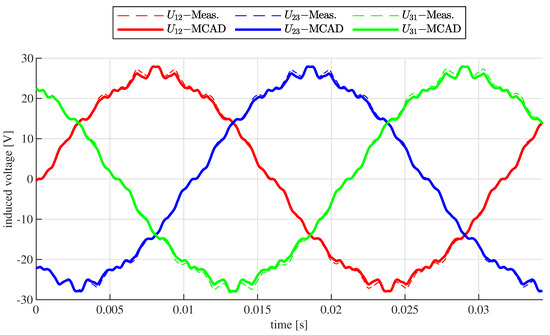 The characteristics of the magnet were found based on the induced voltage test. The motor was run via an external drive with a constant speed of rpm (corresponding to the 2862 rpm of the load drive), and the open-winding line voltages were measured. The test results are depicted in Figure 5 (dashed lines).