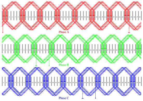The winding for each phase consists of 8 groups (8 turns each), and all groups within one phase are connected in series. The coil span equals slots (17). The number of slots per phase and pole equals . The winding diagram is depicted in Figure 6. The three phases are connected in a star configuration with isolated neutral point. One phase’s resistance was found to be equal m.