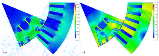 Simulation results. Flux density distribution for two cases: (a) No-load operation— A and A. (b) Maximal torque— A and A.
