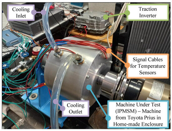 The picture of the motor closed in the homemade enclosure is depicted in Figure 8. The motor shaft is connected with the auxiliary load drive via the torque measurement sensor DATAFLEX 42/200 from KTR Systems GmbH (Rheine, Germany). The auxiliary drive controls the speed at a constant value during experiments. This drive is connected to the examined machine using the reduction gear of ratio 1:6 to raise its torque to the level required by the Toyota Prius machine. It results in the maximal speed limitation of the test bench at the level of rpm (corresponding to the 3600 rpm of the load drive). For this reason, the tests described in the next chapter are performed at a speed of rpm (corresponding to the 3300 rpm of the load drive), i.e., slightly under the maximal limit.
