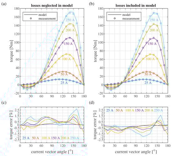The comparison of the experimental results and the model output is depicted in Figure 9. The left column (Figure 9a,c) depicts the simulation results when machine losses are neglected. In that case, the model inaccuracy reaches 2.7% of the official maximal torque value of 163 Nm. The right column (Figure 9b,d) depicts the results after including the losses in the simulation model. In that case, the matching is better since the remanent flux density value of the magnet was tuned based on these results. In that case, the model accuracy is always better than 2%. Based on these results, an excellent match of the model can be stated.