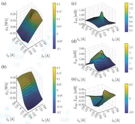 Machine parameter surfaces needed for the dynamical model of the machine: (a) d-axis flux linkage; (b) q-axis flux linkage; (c) d-axis differential self-inductance; (d) q-axis differential self-inductance; (e) differential cross-inductances.