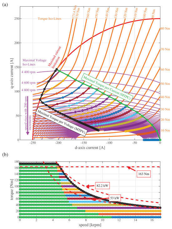 Operational points of the drive at DC-link voltage 600 V: (a) current-space-vector loci and (b) torque vs. speed. The colored dots correspond to the field weakening operation points. These dots have the common color for the points lying at particular torque iso-line in subfigure (a). In the subfigure (b), the corresponding colors are used to indicate the operating points of the same torque levels as in the subfigure (a).