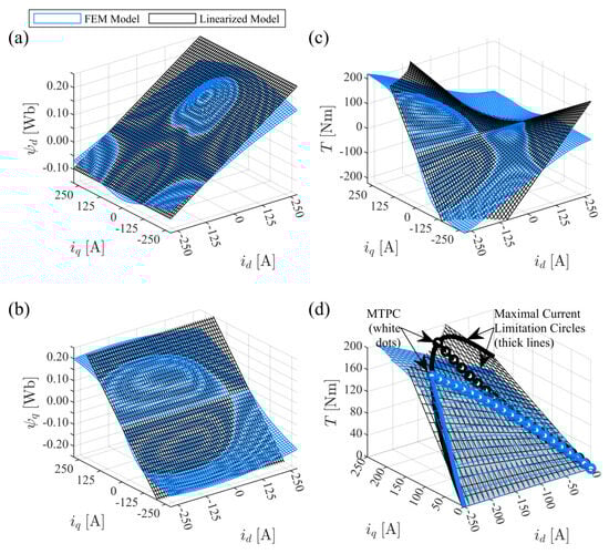 The flux linkages calculated with the linear model (10) are depicted as black planes in Figure 12a,b. For the comparison, the flux linkages obtained with the non-linear FEM model are depicted as blue surfaces. The electromagnetic torque (2c) calculated using both models is shown in Figure 12c.