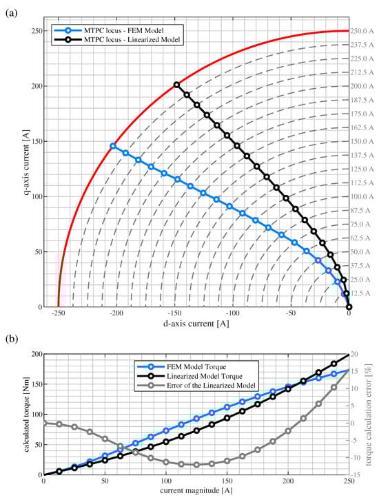 The MTPC loci are also depicted at the current -plane in Figure 13a for better readability, and the resulting torque vs. current magnitude plots are shown in Figure 13b. As the results obtained with the non-linear model can be considered as the reference for the comparison, the linearized model’s calculation error can be expressed as the difference between the values calculated with both models expressed in percents of the nominal torque 163 Nm (see gray curve in Figure 13b). The torque calculation error for the linearized model varies in the range of −12.1% to +15.5%, which is almost twice as big as the error obtained in the similar analysis for the BMWi3 [11]. This is another indicator that the saturation of the Toyota Prius machine’s magnetic circuit is higher.