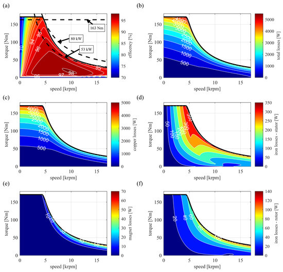 Efficiency and loss maps obtained with the FEM model considering losses: (a) efficiency, (b) total machine losses, (c) copper losses—sum of the DC and AC losses, (d) iron losses in the stator, (e) magnet losses, and (f) iron losses in the rotor.