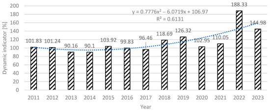 Changes in the prices of energy in Poland (previous year = 100). Source: The authors’ original compilation based on [38].