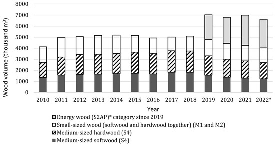 The amount of firewood harvested between 2010 and 2022 [thousand m3]. Source: [42,43,44,45,46]. * The data for 2022 were estimated according to the planned timber harvest volume for that year.