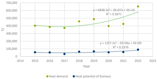 Heat demand and biomass potential in Poland. Source: Authors’ original compilation based on [53,54].