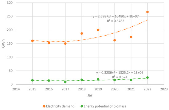 Electricity demand and biomass potential in Poland. Source: Authors’ original compilation based on [53,54].
