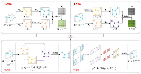 Traffic flow data possess both temporal and spatial attributes. Spatially, traffic conditions at different locations influence each other dynamically. Temporally, correlations exist between traffic conditions across different time slices. To capture the temporal and spatial characteristics simultaneously, spatial–temporal blocks (ST blocks) are employed in the WSTGCN model. In the WSTGCN, each periodic component has stacks of multiple ST blocks. And each ST block is composed of a spatial–temporal attention mechanism (SAttn + TAttn) and a spatial–temporal convolutional network (CNN + GCN). Figure 2 shows an ST block as an example. Assume that this block is the l-th block in the resent component, and the input is = {, ,…, } ∈ N×Cl−1×Tl−1.