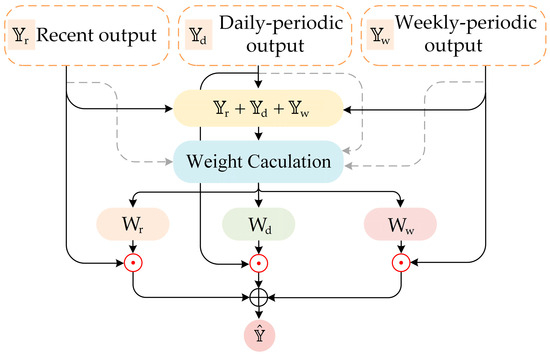 Based on the outputs of periodic components, the weight fusion mechanism is innovatively used to obtain the final output of the WSTGCN. Compared with ASTGCN, which fuses outputs using a fully connected layer, WSTGCN identifies the weight of each component before the fusing operation, resulting in a more reasonable and accurate final output. The weight fusion mechanism is shown in Figure 3.