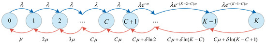Based on the arriving rate and leaving rate, the Markov chain is used to model the charging state transitions of EVs, which have two states: arriving and leaving. The state transition diagram is shown in Figure 4.