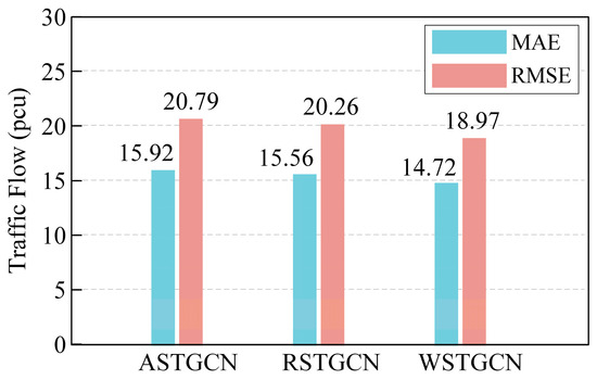 To further validate the effectiveness of the modified residual modules and the introduced weight fusion in the WSTGCN model, ablation experiments are further conducted. To validate the modified residual modules, ASTGCN and the residual improved STGCN (RSTGCN) are compared. RSTGCN only incorporates the residual improvement module into ASTGCN but does not perform weight fusion. Moreover, RSTGCN and WSTGCN are compared to validate the effectiveness of the weight fusion, since WSTGCN further introduces the weight fusion mechanism based on the RSTGCN. Each model is used to predict traffic flow for the next hour, and MAE and RMSE are used as metrics.