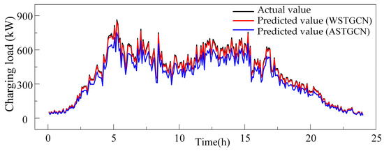 To validate the impact of the proposed WSTGCN model on the accuracy of charging load predictions, both the WSTGCN and benchmark ASTGCN models are used for traffic flow prediction. And then, based on the traffic flow prediction results, the improved queuing model is used to predict the charging load of FCS. The charging load prediction results are shown in Figure 8. To perform further quantitative analysis, the MAE and RMSE are selected as metrics to compare the prediction accuracy of the two models.