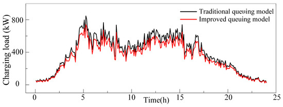 From Figure 9, it can be intuitively seen that the charging load predicted by the improved queuing theory model is lower than that of the traditional queuing theory model. This may be because the subjective behaviors of EV owners are fully considered in the improved queuing theory model, affecting the prediction results significantly. Due to the limited capacity of the FCSs, some EVs leave the FCS without receiving charging service, resulting in a loss of charging load.