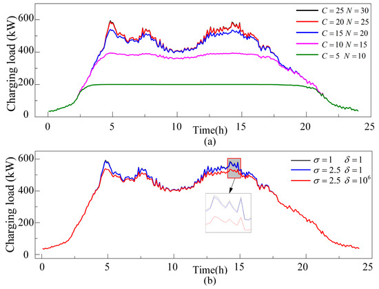 Figure 10b shows the impact of the refusal parameter σ and the impatience parameter δ. The results show that if drivers are more sensitive to waiting times, reflected by a larger refusal parameter σ and impatience parameter δ, the charging load decreases accordingly. Additionally, it can be observed that the reduction in charging loads is particularly noticeable during peak periods. This is because, during the peak time, the number of queuing EVs increases, resulting in a larger leaving rate and lower arrival rate than other periods, thus leading to a larger loss in charging load.