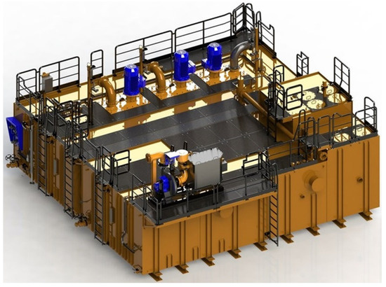 Oil lubrication systems supply oil to slide bearings located on the turbine set shaft. In order to ensure proper and trouble-free operation of the bearings, the oil should have an appropriate viscosity, temperature, purity, and air and water content and be supplied in an appropriate quantity. During the operation of the lubrication system, the oil in slide bearings forms an oil film, reducing the coefficient of friction. Oil additionally performs the function of heat dissipation by cooling the slide bearings. Slide bearings are equipped with seals through which air enters the bearing. During the operation of the bearing, air comes into contact with oil in the gap between the rotating shaft and the fixed surface of the bearing. This results in air being drawn into the oil, intensive mixing, and compression of the mixture. Then, the oil–air mixture flows out of the bearing, expanding rapidly to form a spray jet, which then goes through the return pipelines in the form of a heavily aerated and heavily agitated mixture and into the tank. Lubrication systems are often equipped with oil mist separators (OMSs), which perform several functions: they generate negative pressure in the tank, return pipeline, and bearings; precipitate oil from the oil mist; and blow air from the tank into the atmosphere. The resulting negative pressure in the slide bearings additionally prevents oil from leaking, but at the same time, increases the amount of air entering the bearing and then being entrained in the oil. Figure 1 shows an example of a lubrication system’s tank [3]. The lube oil tank presented in Figure 1 is equipped not only with a tank body, but also with elements such as pump units, a pressure control valve, an oil mist separator, return strainers, pressure transmitters, temperature transmitters, level transmitters, shut-off valves, manholes, ladders, and railings.