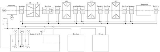 Figure 2 shows an example of a simplified diagram of a lubrication system. The diagram shows the following: a lube oil tank with pump units and a pressure control valve, a cooler skid, a filter skid, a turbine set shaft with turbine stages, bearings, a generator, and a gearbox with a main pump and starting motor. Air enters the hydraulic system through all slide bearings located on the turbine set shaft [3].