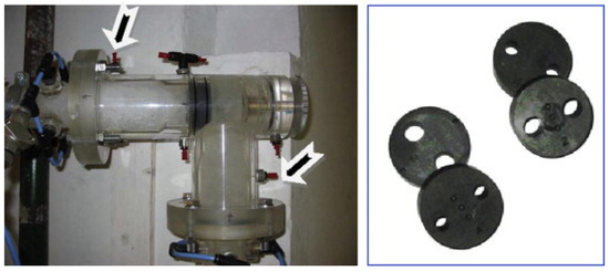 This method, which is similar to the method of measuring pressure drops in a Venturi tube, consists of measuring the pressure drop in an orifice. In order to measure the degree of filling of a two-phase mixture, the pressure drop and the flow rate should be measured. On the basis of the parameters measured and using the determined appropriate correction factors, it is possible to determine the degree of filling of the mixture (correction factors are determined experimentally for the needs of the mathematical model). Figure 8 shows examples of orifices [4,10].