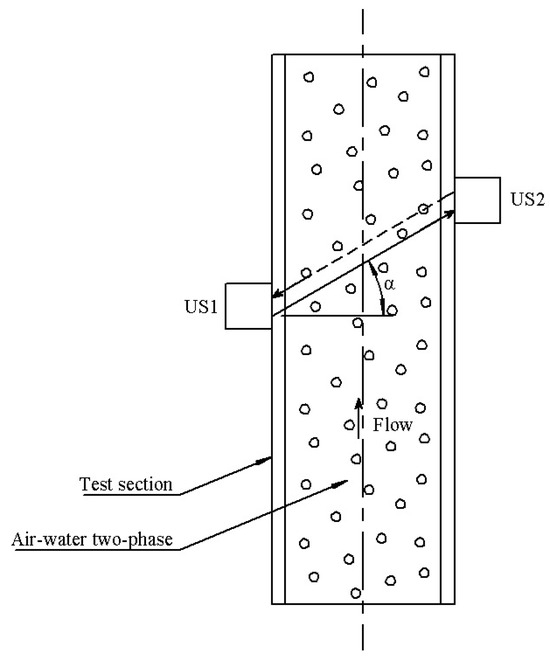 The ultrasonic transit-time method consists of measuring the difference in the transit times of an ultrasonic wave through a flowing two-phase mixture. An ultrasonic wave is sent in two directions: downstream and upstream. The difference in the time of transit of the ultrasonic wave through the mixture allows for the calculation of the flow rate and the number and size of air bubbles. Figure 22 shows a diagram of a measurement method exploiting an ultrasonic flowmeter using the transit-time method [24].