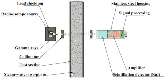 Methods based on gamma radiation use the phenomenon of attenuating gamma radiation penetrating the object under study. Gamma radiation emitted by the source while passing through the medium under study is attenuated in proportion to the density of the medium and then reaches the detector. When testing a two-phase mixture of a liquid and a gas, the liquid, which has a much higher density, will attenuate the radiation more strongly than the gas. Figure 24 presents a diagram of the use of the gamma radiation method [4,26].