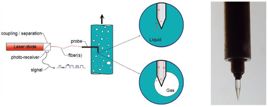 The fiber-optic method consists of measuring reflected light in an optical probe, the tip of which is placed in a measuring tube through which a two-phase mixture flows. The light flowing through the optical fiber reaches the end of the probe, which has the shape of a sharp cone. If the end of the probe comes into contact with a liquid, then, due to light refraction at the liquid–probe border, light is emitted from the optical fiber. If the end of the probe comes into contact with a gas, the light is reflected internally and returns through the optical fiber to the detector. Based on the analysis of signals from the optical probe, the local fill coefficient, bubble size, and flow velocity can be determined. Figure 26 presents a diagram of the use of the fiber-optic method [4,28].