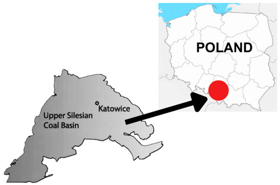 The Upper Silesian Coal Basin is located in the Silesian Voivodeship and the eastern part in the Małopolskie Voivodeship. The USCB occupies an area of about 7490 km2; in Poland, the basin area is estimated to be about 5760 km2 [10]. The total area of the documented deposits is over 3049 km2. Currently, 80.05% of the documented resources of proven reserves of Polish hard coals occur in this basin. As of 31 December 2023, 40 deposits have been found in the basin where hard coal mining is carried out (the total number of deposits in the USCB is 144; the rest are undeveloped, or their exploitation has been abandoned) [11]. The map (Figure 2) shows the localization of the USCB.