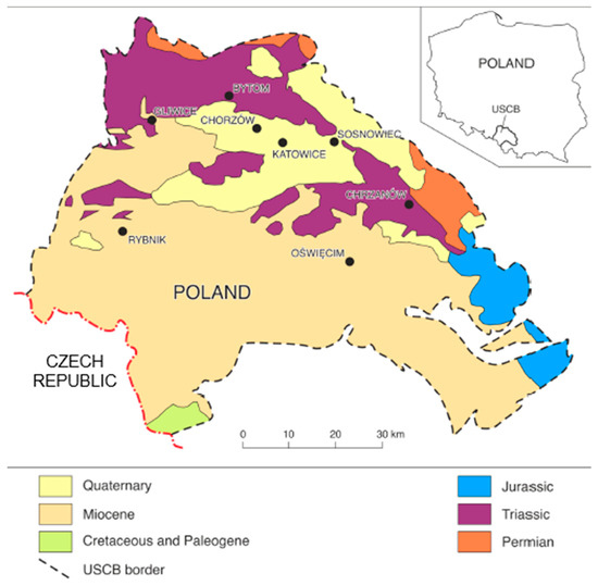 Most of the basin is located within the range of the Carpathian Foredeep, covered with Neogene molasses, and some of its fragments lie under the influence of the Flemish Carpathians. The northeastern part of the USCB is located within the reach of the platform cover, which is covered with Mesozoic sediments. In this part of the basin, Jurassic and Triassic formations constitute the southern part of the Silesian–Krakow monocline, and the productive carbon formations occurring in this area are part of the younger Paleozoic pedestal of the Varyscian platform [12]. The boundaries of the USCB were determined based on the range of coal-bearing tracks of the upper carbon and through fault lines. In the west, it is limited by folded flysch formations containing less carbon. The northern and east boundaries pass under the Perm and the Triassic series. Below the carboniferous formations are folded Lower-Paleozoic formations, on which Devonian (carbon limestone) and bottom carbon are located. The southern border runs under the impression of the Carpathian flysch; in this area, there are metamorphic rocks of the Precambrian and above the tracks of Cambric and Devonian. The carboniferous floor in this area lies below 2000–3000 m; in some places, it reaches even 5000 m [5]. Formations of productive carbon dominate the geological profile of the basin. In the ceiling are deposits of Cenozoic and Mesozoic, locally also Perm, while there are pieces of older Paleozoic in the ceiling. Four lithostratigraphic series are distinguished in the carbon profile: the parallel series (SP), the Upper Silesian sandstone series (GSP), the Mudstone Series (SM), and the Krakow Sandstone Series (KSP). In these formations are complexes of clay–mudstone–sandstone rocks with decks of hard coal. The GSP and KSP are dominated by sandstones; therefore, a greater presence of aquifers than the others characterizes these formations.