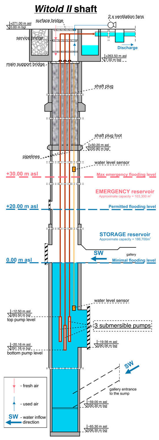 The graphic below (Figure 4) shows the profile of the pumping station. The three submersible pumps are located at a depth of approximately 290 m. The level of the top pump is at a depth of 283.5 m bsl, and the bottom pump level is at a depth of 291.16 m bsl. This installation also includes water level sensors (the first is located above the maximum emergency flooding levels, and the second is located above the submersible pumps). Two fans are located on the surface. The main support bridge is located at a depth 7.5 m bsl. The approximate capacity of the emergency reservoir is 103,300 m3.
