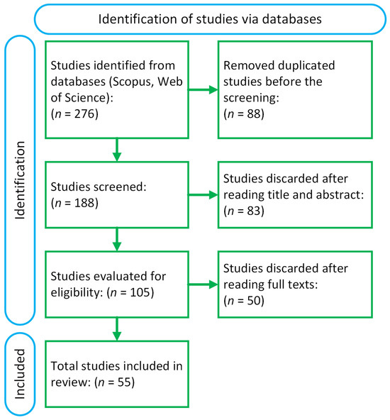 A total of 276 references were found from the database search, with 135 from Scopus and 141 from Web of Science. Once duplicates were removed, 188 studies were left. From these, 83 were eliminated after reviewing their titles and abstracts. After a full-text review, an additional 50 studies were removed because they did not meet the eligibility criteria. In the end, 55 studies that fulfilled the criteria were selected for this systematic review (See Figure 1).