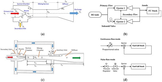 - Yu, M.; Wang, C.; Wang, L.; Wang, X.; Li, D. Auxiliary-ejector-based hydrogen recirculation system to broaden PEMFC operating range. Int. J. Hydrogen Energy 2024, 57, 515–529. [Google Scholar] [CrossRef]
