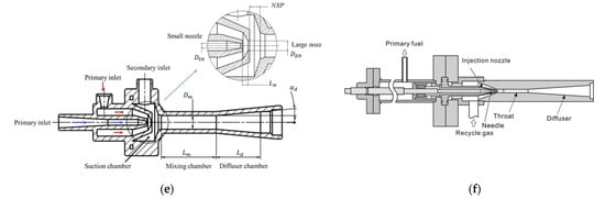 Various ejector types in the literature: (a) conventional ejector with narrow operation range [], and wide-operating-range ejector, (b) double ejector [], (c) bypass ejector [], (d) pulsed ejector [], (e) multi-nozzle ejector [], and (f) variable-geometry ejector (adapted from []).