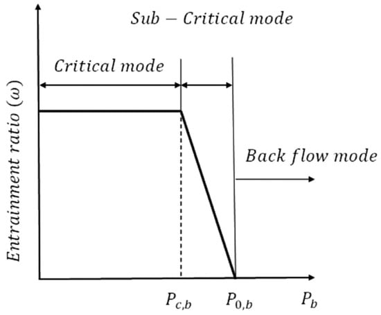 - Subcritical or single choking state: In this mode, the discharge pressure (Pc,b < Pb < P0,b) exceeds the critical pressure. As a result, the entrainment ratio experiences a significant reduction as the discharge pressure increases;