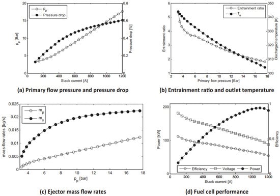Besagni et al. [] employed an integrated approach using a CFD model based on lumped parameters to assess the performance of a conventional ejector with a subsonic nozzle required for recirculation of the anode in PEMFC systems. According to their simulation results (Figure 7), they observed that there is a reduction in the efficiency of the fuel cell while the current of the stack rises, which is expected due to polarization effects. On the contrary, there would be an increase in the magnitude of the power of the fuel cell until it arrives at a maximum amount. It is important to note that the studied ejector does not ensure the optimal entrainment ratio for the fuel cell all the time.