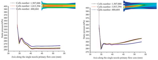Xue et al. [] designed, built, and evaluated an innovative multi-nozzle ejector (see Figure 8) capable of covering a broad range of output power from 20 kW to 100 kW, devoid of considerable differences in the magnitude of pressure at the primary inlet, simply by changing the nozzle operation modes. It was observed that when the nozzles are open and work simultaneously, some issues like vortices would be efficiently managed. Furthermore, the two-nozzle operation mode is able to obtain the greatest recirculation capacity. They also analyzed the magnitude of pressure drop in two different operation modes along the ejector. As can be seen in Figure 9, the pressure dramatically drops in both cases, and then, after combining with secondary flow, the pressure rises.