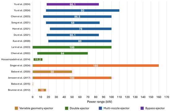 Power range covered by each ejector-based hydrogen recirculation configuration in the literature [,,,,,,,,,,,,,,].
