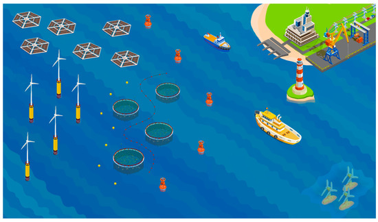 Graphic representation of all studied elements that can coexist in a MUP: aquaculture, offshore wind energy, offshore solar energy, marine energy represented by a tidal energy converter (for the elaboration of this image, the vectors were taken from [13]).