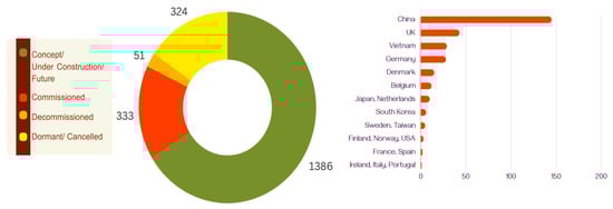 Beyond the commissioned offshore wind farms, there exists a substantial number of projects, totaling 1386, currently in various stages such as construction, conceptualization, or earmarked for future development. Additionally, there is an equally large number of projects, akin to those commissioned, that have been canceled but may potentially be revived in the future. Furthermore, Figure 3 illustrates a rising trend in decommissioned offshore wind farms, reflecting industry dynamics and lifecycle management considerations. These observations underscore the dynamic nature of offshore wind energy development, characterized by ongoing project evolution and strategic decision-making influenced by economic, environmental, and regulatory factors.