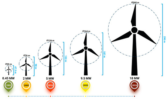 The wind turbines and their foundations are the most essential components of offshore wind farms [19]. The wind turbine, including the rotor, nacelle, and tower, is responsible for converting kinetic wind energy into electrical energy. Wind turbines have seen substantial advancements over time. Presently, there are 43 manufacturers of wind turbines, with Siemens and Vestas being the most prominent. The CSSC Haizhuang H260-18 MW (Figure 4) has emerged as the most powerful operating wind turbine, demonstrating a significant improvement in power output over the first offshore wind turbine ever built. Technological progress in turbines enables them to efficiently harness larger amounts of wind energy, resulting in increased power generation. This innovation leads to improved efficiency and lower prices per megawatt-hour, making offshore wind energy more competitive compared to conventional energy sources.