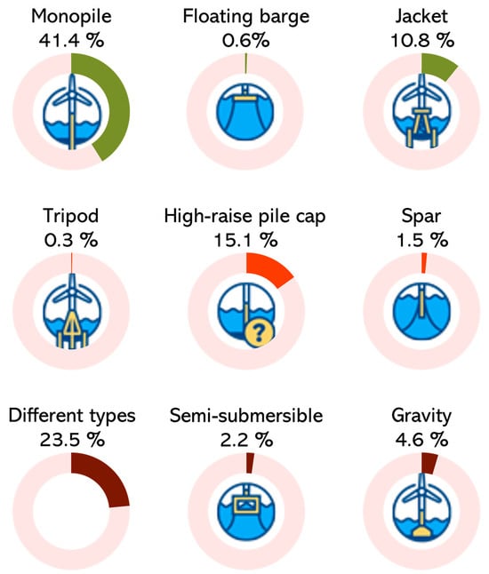 Types of foundations and the percentage they occupy in operational wind farms.