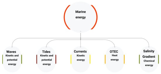 Marine energy, also known as ocean energy, is a rapidly growing sector in the world of renewable energy sources. It utilizes the immense, unexplored capabilities of the Earth’s oceans to produce electricity through natural occurrences like waves, tides, currents, and temperature variations. Marine energy is a tempting route for scientific research and technical innovation, despite the fact that it is still in its early phases compared to more established renewable technologies such as wind and solar [48,49]. The following are the various types of marine energy: wave energy, tidal energy, ocean thermal energy, ocean current energy, and osmotic energy (Figure 6).