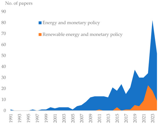 First of all, our research provided a timeline of the growing interest in analysing the impact of monetary policy on the energy sector, as well as the point at which the interest in studying the relationship between renewable energy and monetary policy became evident. Although the first few WoS papers addressing the connections between monetary policy and energy-environment issues were registered in the 1990s, only after 2005 did the number of publications that dealt with this topic increase significantly. However, the first WoS article that tangentially addresses the role of monetary policy on renewable energy was published in 2011.