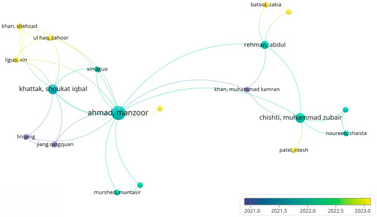 Overlay map for authors presenting the collaboration patterns among researchers, with nodes colored by the period of their research contributions.