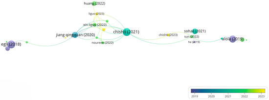 Analysing the bibliographic coupling between countries using a criterion of a minimum of three citations for the papers indicates 13 countries meet the criterion out of the total of 37 countries. The data are presented in Table 2 and can be visualised in Figure 7, which shows the bibliographic coupling between countries using a strict criterion. The size of the nodes indicates the number of citations, while the links represent the strength of the coupling. The data indicate the connections between these countries and the influence of each country in this field. Countries such as China, the US, and Germany are well connected, indicating intense research activity and powerful international cooperation.