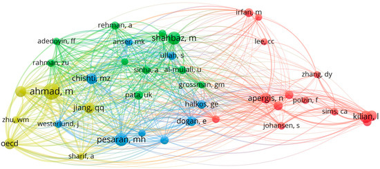 In terms of authorship clusters, we identified networks of cooperation between authors, as presented in Figure 3, containing 19 items, split into five different clusters, with 3–4 items each. Figure 3 also reveals the evolution in time of the publications, using a color code for the publication years. This allows the observation of temporal tendencies in authors’ cooperation. We note with the colour purple the authors who started to contribute to the field several years before, establishing the basis for future research. We then have an area of intermediary research, with author clusters working to develop research in the field, consolidating and expanding existing knowledge. Finally, recent contributions are highlighted in yellow. These authors reflect the new tendencies and research trends in the field of renewable energy and monetary policy.