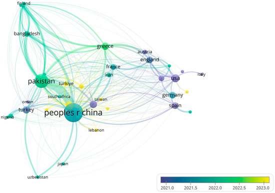 In Figure 4, the collaboration network between countries is visualised, revealing the international connection in the research regarding renewable energy and monetary policy. Larger nodes represent countries with more extensive research output and stronger international connections. The most prominent countries in the network include China, Pakistan, and the US. These countries are well connected, indicating the existence of significant international cooperation. China is the largest node in the network, which indicates a large number of international cooperations. China cooperates with various countries, including the US, Pakistan, Iran, and so on, indicating a global influence in this field. Pakistan is another central node that reflects a significant level of research activity in this field and international cooperation (Pakistan has strong links with research in Greece, Finland, and Slovenia). Although not the largest node, the US has strong research connections with European countries, such as Germany, Switzerland, and Sweden, indicating an active transatlantic activity. These networks indicate that research in the field of monetary policy and renewable energy is a global effort in which researchers from various regions of the world are actively involved.