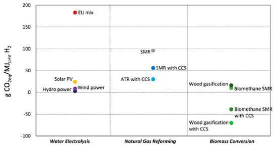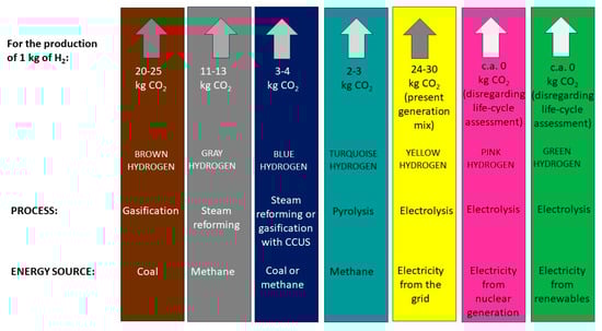 Different hydrogen production processes entail the generation of very different amounts of CO2, giving rise to the well-known color-code table shown in Figure 1.