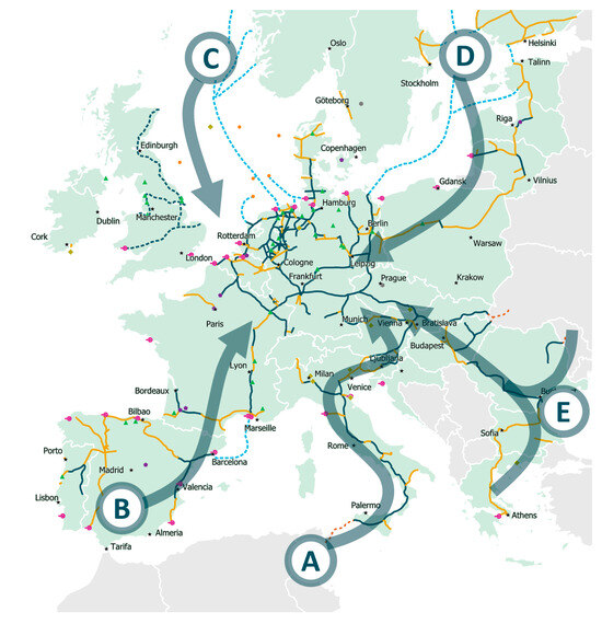 - European Hydrogen Backbone Initiative. Available online: https://www.ehb.eu/files/downloads/EHB-Supply-corridors-presentation-ExecSum.pdf (accessed on 13 June 2024).